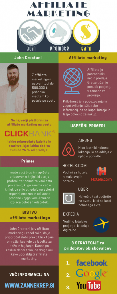 Affiliate marketing refers to an intermediary method of selling. It involves marketing the offers of certain companies, for which you then receive an agreed commission on every completed sale. John says that affiliate marketing is the best way to earn money online. The opportunity lies not in creating products that take up your time and money, but in connecting people and making information easier to use, so that buyers can make easier and faster purchasing decisions. Everything that is bought online can be connected through affiliate marketing. I have researched the system that John teaches for you. On the world’s largest affiliate marketing platform ClickBank you can recommend products and services where you can earn up to 75 percent of each sale. An example of affiliate marketing: You have your own blog and you write a post about a book you’ve read, and you offer anyone interested in learning more about the book a link to view it on the Amazon online store, and for every book sold, Amazon pays you a certain percentage. Other examples of affiliate marketing: