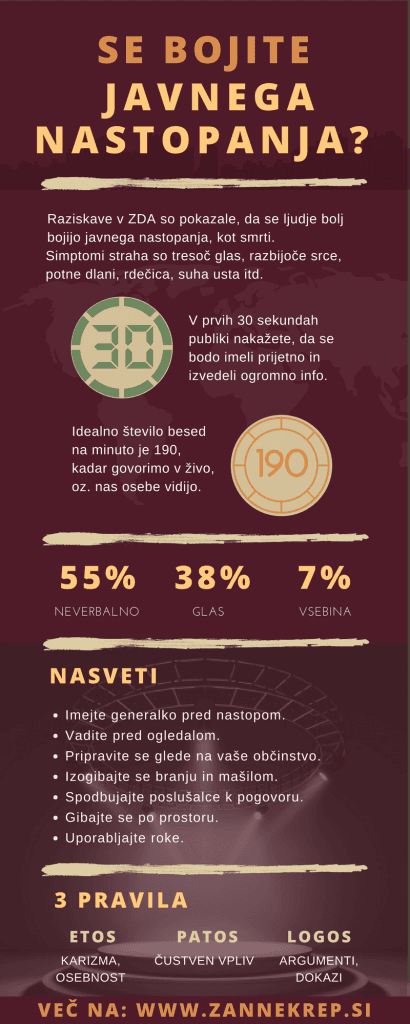 The symptoms of fear of public speaking include a trembling voice, a racing heart, sweaty palms, blushing, dry mouth, etc. I personally learned rhetoric from TV presenter Suzana Perman and I would like to publicly thank her for all the knowledge she gave me. Rhetoric deals with proper speaking, performance, facial expressions, etc.