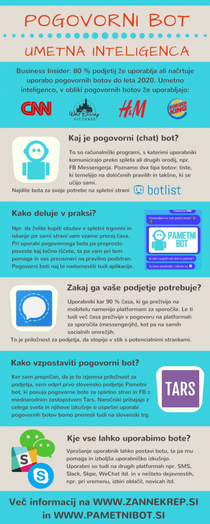 Artificial intelligence has arrived in the form of chatbots, already being used by established companies such as Disney, H&M, Ebay, CNN and Burger King, and their use has also been publicly praised by celebrities such as Katy Perry. In Slovenia, very few companies are currently using chatbots, but this will change within a few years. Bots have received a great deal of praise in many internationally recognized media outlets, for example they have been covered by Forbes, CNBC and Venture Beat.