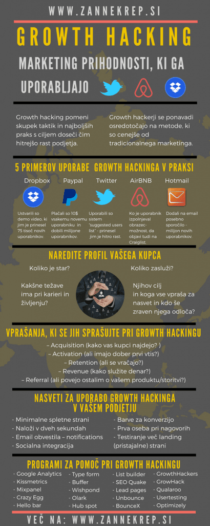 Growth hacking encompasses the optimization of landing pages, which you use for collecting emails using LeadPages, email marketing using Mailchimp, website optimization – SEO and product optimization, as well as website analysis using Google Analytics and much more.