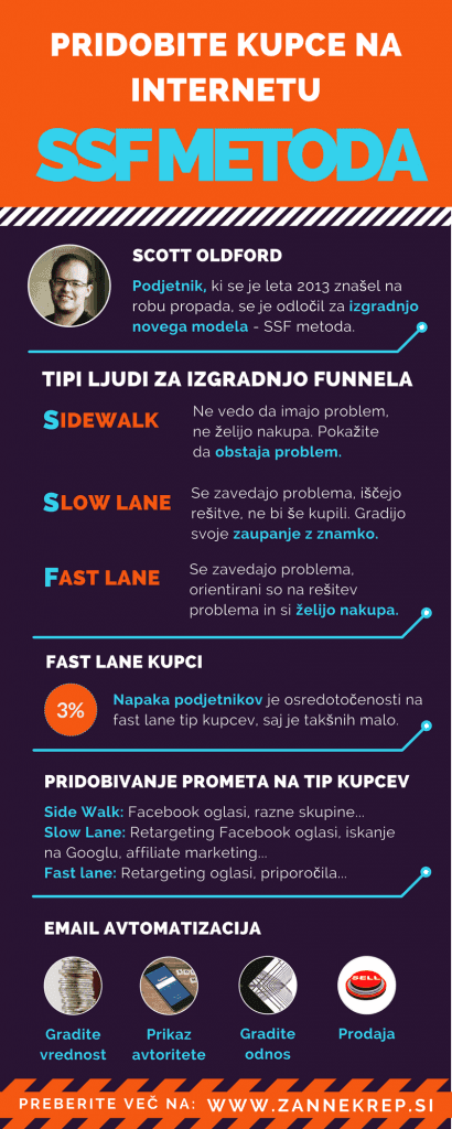 Scott says this no longer works, as Facebook advertising is already being used by millions of advertisers, and therefore Scott recommends the SSF method (Sidewalk, Slow lane, and Fast lane), which he calls the improved funnel.