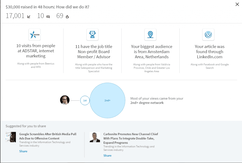 - Write quality articles, participate in groups relevant to your industry, and post at least two links/images/news items per week. By being active on LinkedIn, your number of views grows simply because people see you, and LinkedIn also ranks active profiles higher in search results. The practice that has worked best for Maja Voje is publishing a LinkedIn article. She does this a few times a year, only for the highest quality content. Others achieve similar results, for example Frugi by publishing slides on SlideShare. Maja received 12 inquiries for consulting projects from the article she wrote, which is visible HERE. The post was not sponsored on LinkedIn. All the outreach came from social media channels and due to the fact that the topic is truly interesting and was well indexed on Google. You can see more in the photo below: