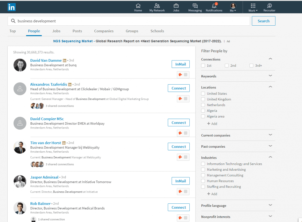 You can also get very interesting suggestions for new contacts by searching for people through the search engine (search) and filtering them by the criteria on the right, as shown in the photo below: