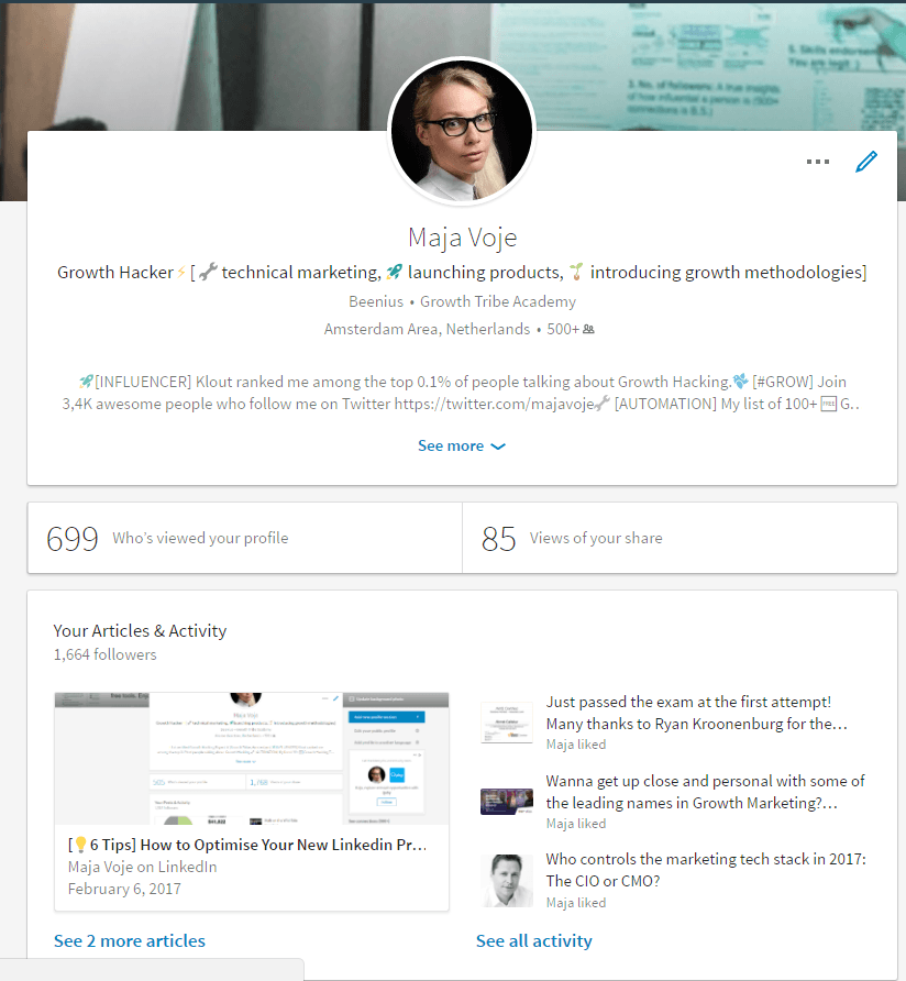 Since your headline, the first two lines of your summary, and your most recent work experience are the most visible elements in the new LinkedIn interface, it’s only appropriate to condense the key information into these mentioned areas. Two really simple methods to spark interest are to incorporate relevant numbers into your text that demonstrate you’re good at your job (growth, revenue, number of markets, etc.) and well-known elements such as famous brands (partners, suppliers, clients). Maja recommends reading the article she wrote on her LinkedIn.