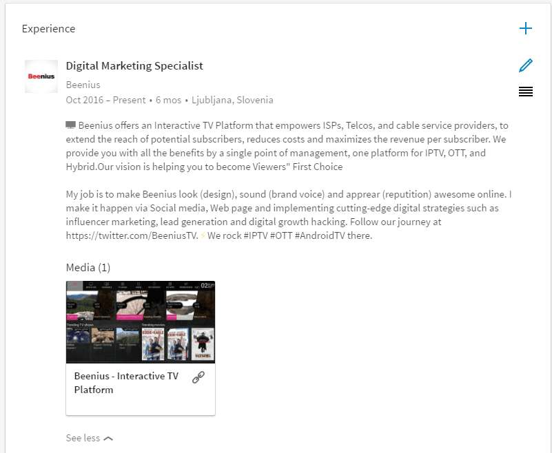 In the new LinkedIn interface, 6 recent posts are displayed under activity (Žan’s activity). If Žan were to write a LinkedIn article, he would have only three recent posts and a prominently featured article that drives traffic in the long run. Žan should add text and multimedia to his most recent position (e.g. links to pages), which is the only one automatically displayed. He can copy from mine, which is visible at www.linkedin.com/in/majavoje/ under Your Articles & Activity and Experience: