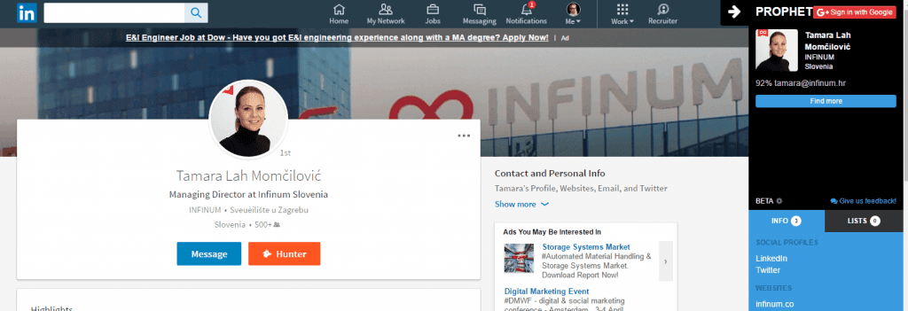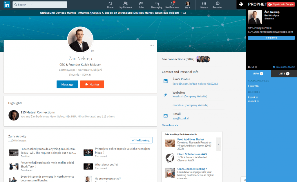 Žan’s email is not obvious enough. If you want to contact people on LinkedIn for new business opportunities, it is good practice to place your website and email in a visible location. I had to find Žan’s email using the Prophet tool (visible in the photo below, top right):