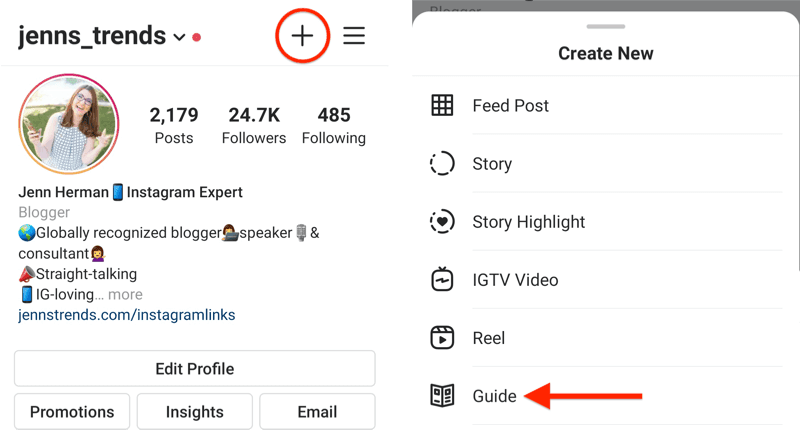 Similar to “Instagram Highlights,” the “Guides” feature allows you to combine your favorite posts into one featured piece of content. However, there are some key differences. This feature is more “editorial” in format, like reading an article. You can include photos and posts from your feed, as well as photos and posts from other people that you have saved.