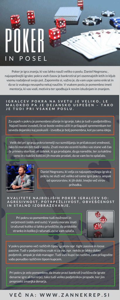 Daniel, who is considered the most successful, no longer earns much from the game of poker itself, but from sponsorships that he receives. In business too, you should not focus on just one source of income — have multiple. In poker, the cards and position matter — if you are last to act, it is easier to make decisions since you can see what your opponents do. In business, position represents location (e.g. a restaurant), which is one of the most important factors, while the cards represent what kind of product you bring to the market. In poker, you have 169 combinations available, and numerous combinations are also possible in business: from whether you are selling to individuals, companies, or the government, to where you will be selling, etc.